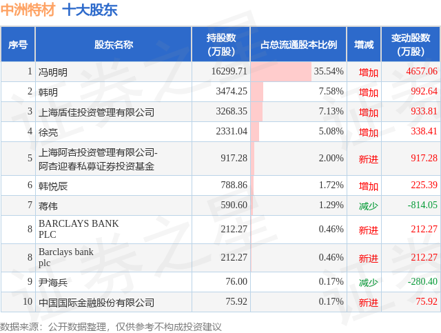 根据中洲特材2025年中报公布的十大股东详情如下: