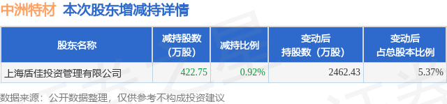 证券之星消息,10月10日中洲特材发布公告《中洲特材:关于持股5%以上股东权益变动触及1%暨减持股份计划实施完毕的公告》,其股东上海盾佳投资管理有限公司于2025年9月16日至2025年10月9日间合计减持422.75万股,占公司目前总股本的0.9217%,变动期间该股股价上涨18.1%,截止10月9日收盘报22.51元。