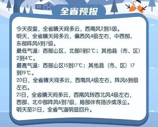 21日,全省西南风转西北风4级左右