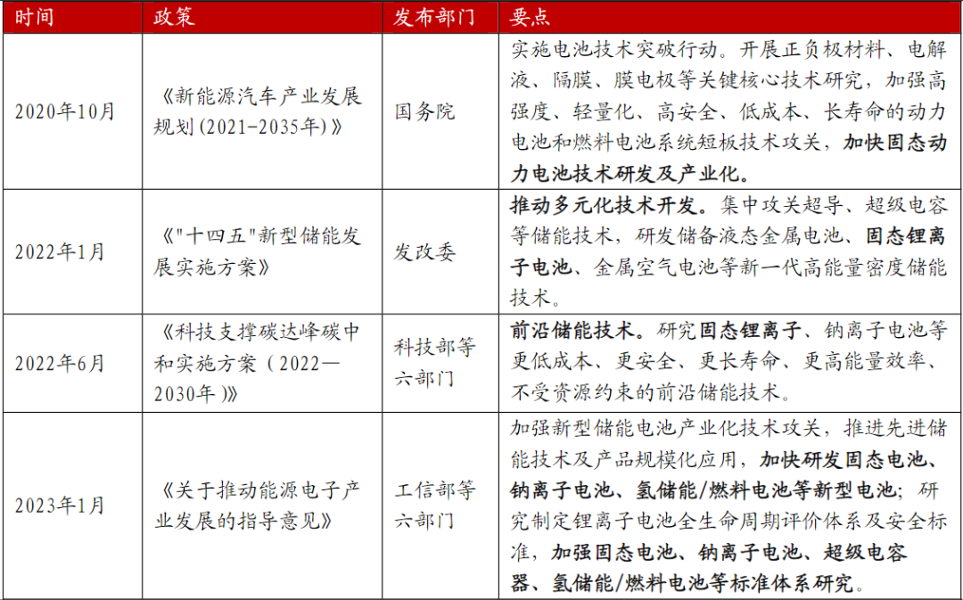 近年来,汽车、储能政策持续加码,支持固态电池产业的发展。2020年,我国发布《新能源汽车产业发展规划(2021—2035)》,提出加快固态动力电池技术研发及产业化,首次把固态电池研发列为行业重点发展对象;2022年1月,《"十四五"新型储能发展实施方案》发布,提出推动多元化技术开发,研发固态电池等新一代高能量密度储能技术;2023年1月,我国发布《关于推动能源电子产业发展的指导意见》,强调加强固态电池等新型储能电池产业化技术攻关,推进先进储能技术及产品规模化应用,同时加强固态电池标准体系研究。