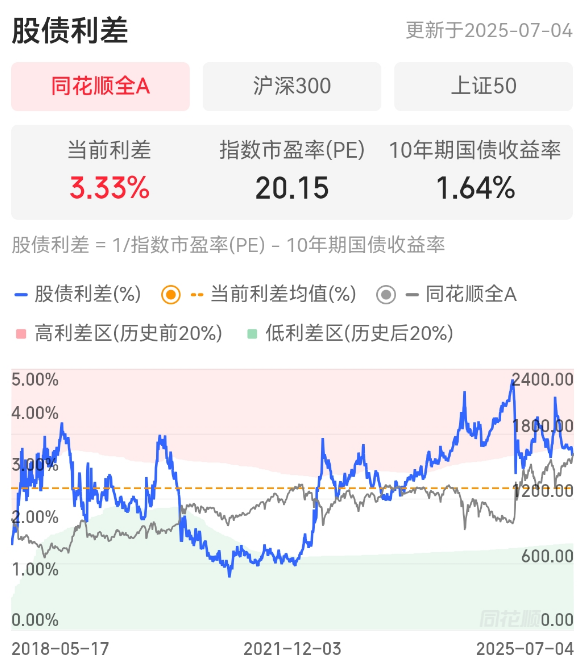 中长期看多,现阶段股债利差较大。截止7月4日同花顺全A当前的股债利差3.33%,位于高利差历史前20%区域,投资价值凸显。股债利差越大,则配置股票的性价比越高,股债利差越小,则投资股票的性价比越低。当前市盈率PE20.15倍,10年期国债收益率1.64%。