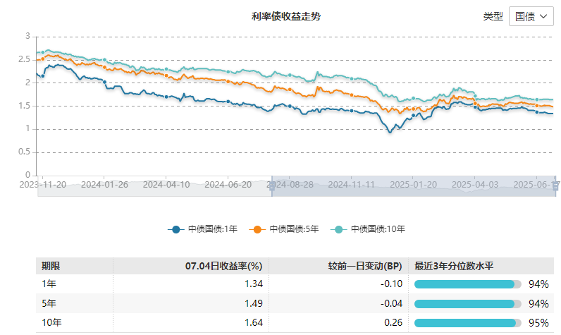 利率债方面,1年国债收益率下行至1.34%,5年国债收益率下行至1.49%,10年期国债收益率1.64%。