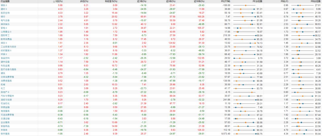 行业表现:上周涨幅前三位:钢铁、建材、医药生物;跌幅前三位:软件服务、半导体、家庭用品。